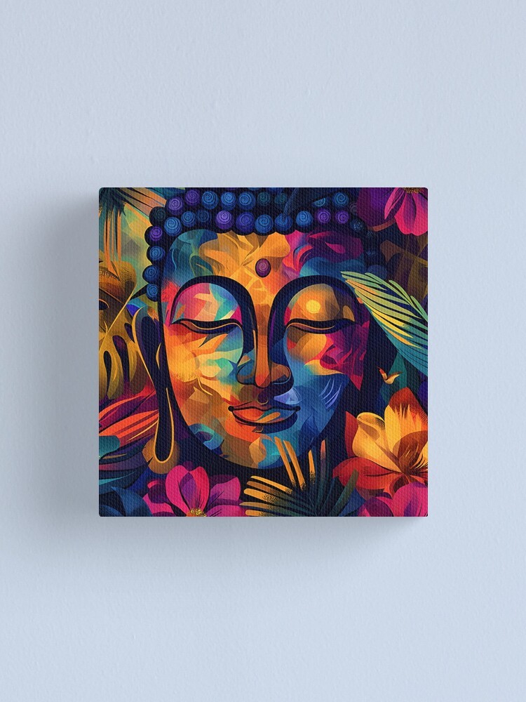 Nestled in the heart of vivid jungle foliage is a serene Buddha face, radiating warmth, wisdom, and inner stillness. The juxtaposition of wild, colorful blooms with tranquil spiritual presence invites the viewer into a space of contemplation and rebirth.