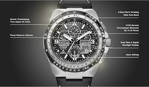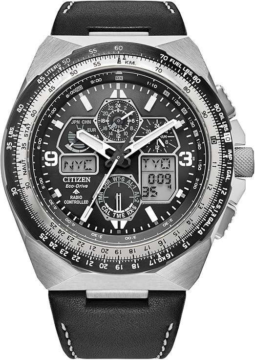 The Citizen Promaster Skyhawk A-T JY8149-05E is an impressive watch packed with cool features, targeting aviation pros and adventurers. With its durable stainless steel build, stylish black dial, and a comfy leather strap, it’s made for everyday wear. This watch is powered by Eco-Drive tech, so you’ll never have to change the battery, and it syncs atomic time signals for super accuracy. Plus, it has a bunch of handy tools like a chronograph, dual time zones, and a slide rule bezel. Eco-friendly and stylish, it’s perfect for anyone who wants a reliable and practical watch on their wrist.