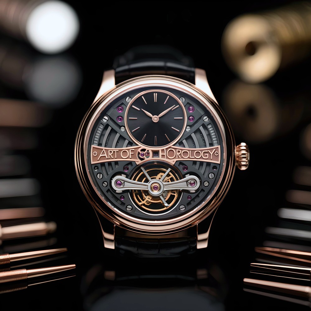 A consistent theme across many of the artworks is the integration of the phrase “Art of Horology” itself. In some pieces, it’s artfully curved above the watch or presented in a bold banner. In others, the phrase is boldly integrated directly into the watch dial as part of the skeletonized design, crafted from rose gold letters that become an integral element of the timepiece’s aesthetic. This reinforces the core message: that these renders are not just technical drawings, but celebrations of a profound art form.